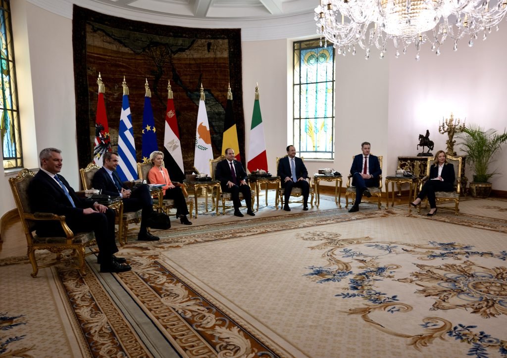 Joint meeting of Giorgia Meloni (Prime Minister of Italy), Ursula von der Leyen (President of the European Commission), Nikos Christodoulidīs (President of the Republic of Cyprus), Alexander De Croo (First Minister of Belgium), Karl Nehammer (Federal Chancellor of Austria), Kyriakos Mītsotakīs (Prime Minister of the Hellenic Republic) with Abdel Fattah al-Sisi, the President of Egypt.